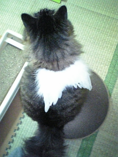 東京は、20℃位まで気温が上がって、 の開花も進んできたことでしょう。ここ札幌は、まだまだ寒い。さすがに、冬の陽射しではなくなってきましたが、外に出てみると、風は冷たいし、今朝は、雪がちょっだけど、舞っていました。午前中、お日様が当たってぽかぽかしていたのですが、あみちゃんが、お外に出せ攻撃をしてきました。もちろん、出しませんが、猫にも、春になってきたことがわかるのでしょうね。あみちゃんは、外の空気を吸うのが好きなので、網戸越しに少し空気を吸わせたら、満足して寝ました。もう少し暖かくなったら、ベスト式のリードをつけて、庭に出してあげようっと。でも、土の上を歩いて、ほりほりしちゃうから、シャンプー覚悟ですぞ!春を待っているのは、ニャンズも同じですね。それにしても、昨日の地震、被災地の方々は、余震などで不安でしょうね。水道などライフラインも途絶えているところもあるようですから、不便でしょうし、避難所ではよく眠れないことでしょう。高齢の方々も多いようですから、皆さん体調を崩さないでいて欲しいですね。早く、日常の生活に復帰できることを祈ります。本当に、普通に生活できることって、ありがたいですね。温かい物を食べられたり、自分のお布団でぐっすり眠れることが、どれだけありがたいかって、なくさないと気づかないことがあるものです。毎日の当たり前の生活に感謝して寝ることにします。エンジェルの羽をつけたレオくんです。