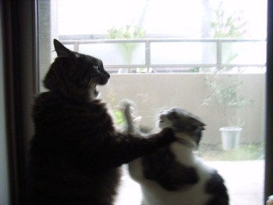 ニャンズには癒されていると同時に、ストレスも与えられています。まぁ、これは相互かもしれませんが・・・先日、嬉しかったのは、朝起きたら、レオぽんが私の右、あみちゃんが私の左に寝ていたこと。ストレスは、2ニャンズが朝と夕方喧嘩をすることです。この前、あみちゃんとレオぽんが恐ろしい形相で喧嘩している写真を撮りました。ボケてるけど・・・ちょっと怖い顔です。覚悟して見てね。