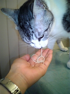 昨夜のことですが、今年初めて、そうめんにしてみました。というのは、メニュー考えられなかったのと、食材が減ってきたことの2つの理由から。わさびを取りに行っている隙に、あみちゃんが皿からそうめんをすすっていた・・・にゃ!上手につるつる食べてました。仕方ないので、あみちゃんがなめていた周囲のそうめんを取り除き、食べさせてみたら・・・あら、おいしそうに食べてる。ためしに、レオちゃんにもあげてみました。食べないと思っていたら、あら・・・食べました。暑いから?そうめんって猫が好きなのかしら?レオぽんは、お魚あげても、うなぎをあげても、食べないんだけどなぁ~今度作った時に、また試してみようっと。あまりあげると、塩分があるから、いけませんが、ほんのちょっぴりですにゃ。ニャンズパパママの皆様、お宅のニャンズは食べますか?今日は、しゃっきり仕事!と思っていたら、あまりしゃっきりしてません。空気清浄機の洗浄とお洗濯が私のやった仕事。空気清浄機は、買ってから初めて洗浄ランプが点いたので、プラズマなんちゃら部というのをはずして、浴槽で洗浄しました。つけ置き1時間 → 流水で洗浄 → つけ置きすすぎ30分 → 流水で十分洗浄→ 陰干し と結構時間はかかりました。水遊び気分でやったので、楽しかったけどね さて、英語の宿題でもやるか・・・きっとそのうち寝てると思いま~す。夕方からコーチングもあるし、レポート採点は夜だにゃ。ニャンズも昼寝中です。あみちゃんは、出窓でカーテンをかぶって寝てるし、レオぽんは私のベッドで寝てますわ~