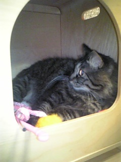 札幌の最高気温は、25℃だったらしい。私は、夕方、郵便物を投函し、スーパーで買い物するという目的で、出かけたけれど、半そでだと、ちょっと寒いくらいでした。(私は寒がり)明日は、27℃まで上がるようだから、ホッとしています。このまま秋に突入というのは、淋しい・・・しかし、来週末東京に行くのは、気温差がありすぎて恐怖。昨夜、珍しくレオが一緒に寝なかったので、朝さわやかに起きられました。ニャンズと一緒に寝ると、やっぱり熟睡できてないのかなぁ~あみちゃんと、レオぽんのために、喧嘩しないように・・・と思って買った、木製のボックス状のベッド、2個もあって、部屋のスペースをかなり占領しています。しかも、その中には、札幌に来て以来1年半近く寝ていないので、ニャンズおもちゃ入れと化していたのです。あまりにも邪魔なので、2つ床に置いていたものを、上に重ねてスペースを確保。すると・・・何と、レオがその上の方で、おもちゃに囲まれながら寝ていたのでした。レオぽん、おもちゃ独り占め!と思っていたのかなぁ~幸せそうに、今朝私が起きるまで、そこで寝ていたようです。今日は、椅子の下で寝ていましたが・・・最近のあみちゃんの寝場所は、マッサージチェアの上。ニャンコーチは、あみちゃんがいない時を見計らって、マッサージチェアを使っています。あみちゃんは、『私の場所!』という顔をして、私を睨み?私のおなかを踏んで、しばらく座ってから、蹴りを入れて立ち去るという行動をします。癒されない・・・かも。今日も、仕事したようなしないような、一日でした。本を1冊読んじゃった。(仕事と関係ない軽い読み物)原稿、いったいいつ書くんだい?と自問自答したけれど・・・明日は、朝早くから仕事なので、明日こそさて、私は明日、どんな日記を書くことになるのでしょう?これも、自分の決意と行動次第ですね。コーチ魂?見せないとまずいかにゃ?