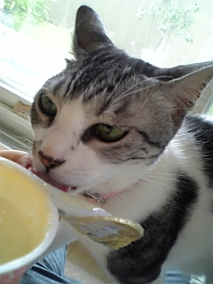 先週は、ジメジメしてそんなに気温が高くなかったのに、土曜日から突然気温上昇。そして、真夏日連続4日となりました。私は元気だけど、実家の父母はばてばてらしく、特に母はご飯も食べられない・・・と。で、今日は、夕方、3人で近所の居酒屋に行って来ました。クーラーもきいてるし、自分で作ったり片づけたりしなくてよいし・・・母も、久しぶりに、食べられた様子。年取るとご飯食べられないことは、大変なことにつながっちゃうからなぁ~ニャンコーチなら、1週間位食べなくても、きっと大丈夫なんだろうけど・・・たまには、一緒に食事する時間も持たなくちゃね。ちょうど良いタイミングでした。我が家のニャンズも、今日は結構だらけていましたが、食欲は落ちず。さすが、ニャンコーチ家のにゃんこだわ。明後日には気温が下がってくるようなので、あと1日がんばりましょう!今日は、にゃんこベッドの掃除、にゃんこトイレの洗浄、お掃除をがんばりました。っが、仕事は手つかず・・・これからちょっぴり仕事しまーす。あ、先日、レオが入っていた(乗っていた?)小さな段ボール箱は、あみとレオが喧嘩した際に、レオが足で踏んだら、ベリッと破れてしまいました。すぐに廃棄処分となりました。今は、ちょっと大きな方の箱を取り合っています。いつまで、もつかにゃ?ヨーグルトの蓋をなめるあみちゃんあみちゃんは、ヨーグルト大好き♪無糖のものもおいしそうに食べますよ