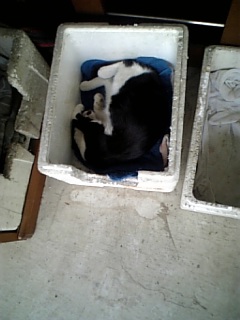 今朝は、ゆっくり起きて、気持ちよかったです。午後からの仕事だったので、ゆっくり出かけました。ニャンズはいないかなぁ~と思って見たけど、いなくてがっかりしていたら・・・あ!いました!お家の人が作ってくれた、発泡スチロールのベッドに、1にゃんが寝ていました。お母さんにゃんこに一番似ている仔猫だ!うふふ・・・ぐっすり寝てかわいいにゃぁ~携帯カメラでカシャ!し、しまった・・・うるさい音立てて脅かしちゃったよぉ~びっくりして、飛び起きてしまいました。ごめんね、ごめんね、と何度も謝り、にゃんこの冷たい視線に耐え、仕事に出かけました。帰りは、ニャンズの姿を見ることはできなかったけど、明日の朝はちょっと早めに出かけるので、会えるかな?東京での楽しみの一つです。隣の工事にも負けず、近くの道路工事にも負けず、元気にいるニャンズを見ると、私も元気で頑張って仕事するぞぉ!って思うのよね。明日は、1日研修なので、結構エネルギー使うかな?でも、ちゃんとエネルギー補給しているから、大丈夫だと思います。仕事するとエネルギーが沸いちゃう気がするんですよ。病気?寝てるところ失礼しました~ でも、可愛いわ♪