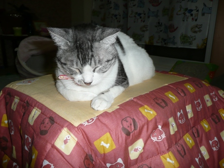 今日は、今一つすっきりしない体調で、朝から一日中寝ては起き・・・時々仕事、という過ごし方でした。熱もなく、これといった症状はありません。しいて言えば、食べ過ぎ?こんな時は、早めに寝るしかありません。札幌では、早くもインフルエンザが出ているようです。この時期に? ・・・と、びっくりですが、病院に仕事で行く機会が多いので、私も早めに予防接種を受けておこうと思います。と言っても、今はちょっと行けないので、11月後半になるかなぁ~それまでは、エキナセアを飲みながら、良く寝て、ほどほどに食べて、予防に心がけます。私も食べすぎですが、このところ、レオの食欲が普段は、あまりご飯に執着しないレオぽんが、このところ、もっとくれ~ と鳴くことが多いのです。体重も増えちゃったから、あげられましぇんよ。 に厳しいくせに、自分は食べすぎて、体調がイマイチになってるわ明日から、2ニャンズプラス1にんげんで、適正量食べることにします。寒気もしていたけど、さっき、ホットカルピスを飲んだら、体がポカポカになりました。結構いい感じです。これ書いたら、寝まーす。レオぽんとコタツ。タヌキっぽい?ちょっと、おくつろぎ。やっぱり体はみ出てる・・・ぼくの物にゃぁ~