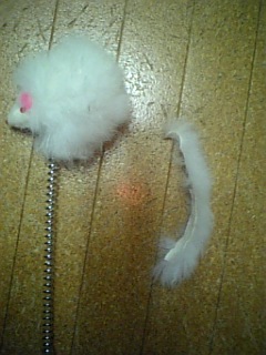 レオぽんが、齧ってちぎった、おもちゃの尻尾部分をあみちゃんに乗っけてみました。結構おとなしくしてます振り向いた目つきがちょっと怖い・・・レオに乗っけてみようとしたら、拒否されました。残念!