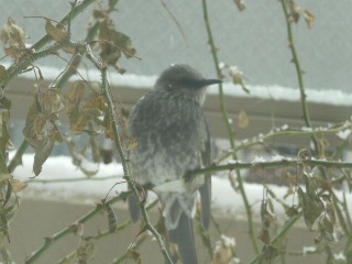 雪が降ると、鳥達の食べるものが少ないだろうなぁ~ と思って、パン屑などをできる限り庭にまいておきます。 だいたい毎日、鳥が2種類やってきます。小さい鳥と大きな鳥が、先日たまたま同じ時に来ていて、大きな鳥は小さな鳥を追い出してしまいました。 生存競争厳しいですね。 でも、その後も小さい方の鳥は、来ているので、安心。 どちらも食べられるように、少し多めにまくようにしました。今日は、パンを食べなかったので、グラノーラを細かくしてまきました。 食べているところは見ていないけれど、明日は食べにくるかな? 大きい方の鳥たぶん、ヒヨドリです。 つがいで来ます 羽ばたいた瞬間 鳥ちゃん達の足跡がたくさん残ってます ヒヨドリは、結構なれなれしくて、私が戸を開けても逃げないことも多いです。 ニャンズを見ると、逃げますが・・・ ニャンズは、鳥ちゃんたちが来ると、刺激があって、楽しそう。 眠気に負けてることも多いですけれどね