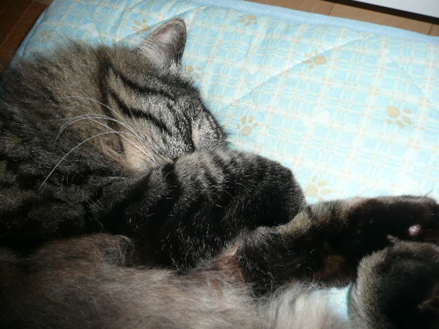 その1:レオぽん その2:あみちゃん もちろん、その3はニャンコーチ(写真なし) 寝る時間増加 + 食べる量増加 = 体重増加 いやぁ~、めでたい!??? そうそう、昨夜は寝かかった頃、レオぽんの雄たけびで起こされてしまいました。 多分、午前3時~3時半頃。 あみちゃんも私と一緒だったので、リビングで一人残されたレオぽんは、ちょっとさびしくなったのかな? その後見た夢は、ピンクのうさぎの着ぐるみのような衣装を着たにゃんこが現れました。 やっぱり3匹目の猫として我が家にやってきたらしいのです。 6年前に見た初夢で、にゃんこがたくさんいる路地を歩いている夢を見たら、レオぽん兄弟が現れたのでした。 母には、お願いだから初夢に猫の夢を見ないで欲しいと頼まれているのですが、 もう新年早々猫の夢見ちゃった・・・ さて、どうなるのでしょうその他、短編の夢をたくさん見て、いくつかは記憶しています。 っが、あまりにも非日常的なので、ここには書けないわ~(多分書いても意味不明) 秘密ヒミツ 今夜も面白い夢見られるかな?私の夢は、なかなか面白いので、自分でも楽しみなんです。頭がこんがらかっているのを夢で整理してくれているのでしょうか?