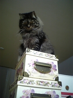 いつの間にか本棚の上に積んである箱の上に乗ってます。