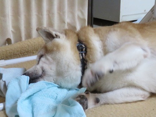 台風も過ぎて一気に秋の寒さがやってきた感じ。けんた君は、歩き回ったりして騒いでいたかと思うといつの間にか静かになる。時々手なぞ動かすので、あ、生きていると\( ̄ー ̄;) 夢でも見ているのだろうか?いずれにしても、頂戴とごちそうさんの夢だろうな。。。騒ぎ疲れたけんた君は、子供のように、突然寝てしまうのでした。ん?あれ?寝姿ばかりで失礼いたします。。。