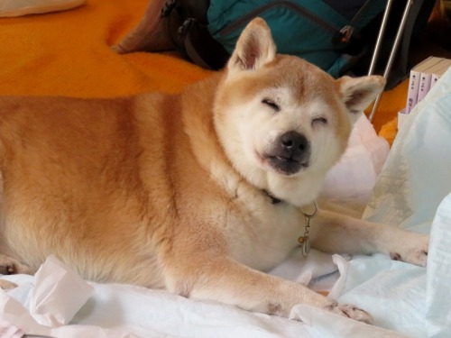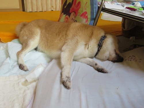 可愛がってくれて、ありがとう。柴犬けんたは、本日未明14才と11ヶ月の生涯を閉じました。昨年、2月に突発性前庭疾患のかかって以来、どんどん元気がなくなって12月には、外に出ることができなくなってきました。それでも、家の中では自力で歩いていましたが春ころからは、ほぼ自力歩行困難の状態となっていました。根が丈夫なけんた君の要求は、寝ているとき以外は夜でも、昼でも家の中を散歩させよとのことだったのでお父さんかお母さんに立たせてもらい家の中を散歩する日々が続きました。先月から今月にかけて、眼振がひどくなり、足ももつれ始め次第に衰弱し、どんどん痩せて7/12頃からは、食事も食べられなくなり、やっと水を飲ませて、頑張っていました。けんたは、「まだ、家にいたい」と必死だったのだと思います。が、昨日から呼吸が弱くなり、本日、7月17日未明に旅立ちました。安らかな笑顔で逝きました。けんたは最後に言ってくれたと思います。お父さん、お母さん、お姉ちゃん、僕は幸せだったよって。でもな、けんた。けんたからお父さんたちが貰った「かけがえのない日々」があったからこそ、みんなで頑張ってこれたんだよ。けんたがいたから、みんなで幸せに暮らしてこれたんだよ。けんた、本当にありがとう。けんたを可愛がってくれた、皆さんに心からお礼申し上げます。この間、更新も訪問も何もせずで、誠に申し訳ないのですが柴犬けんたの日記は、これで終わることといたします。これまでの応援、本当にありがとうございました。