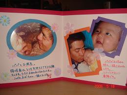 昨日の日記のコメントありがとうございました~♪みなさんデジカメの時間差と写真の量にお困りのようでwやっぱり何処のお宅も同じなんです(*´▽`)(´▽`*)ネーさて、昨日の日記に書いたように・・お義母さんにプレゼントするカードが出来ました。(とてもお恥ずかしいのですが)▲ハルパパとハルの写真▲▲お宮参りとお喰い初めの写真▲こんな感じです見よう見まねで「クラフトブッキング」というものを始めて、第3作目です昨日はお義母さんと外食予定だったので、そこで渡しました。ほんと、最後まで渡すの止めようかと迷ったのですが・・どーにでもなっちゃええええ!って感じでプレゼントしました。でも、意外にお義母さんは喜んでくれたのでε-(´▽`) ホッとしてます。こうゆのって好き嫌いありじゃないですか~・・ほんと、最後まで迷いました外食自体久々だったのですが、焼肉!!(大好物w)嬉しかった~~~~~~♪♪♪♪♪もちろんハルも連れて行ったのですが・・煙たいのか・・うるさいのか・・珍しくねんねせず、ずーっと超超ご機嫌。お義母さんは大喜びで、ずっとハルを抱っこしながら、お肉を焼き焼きしてました(ノ-`*)ンププその顔ったら幸せそうで~。こちらまで幸せにwってか本当に美味しかった~~~~!!!やっぱり自分が作らないってのは、美味しく感じるのかしら?w妊娠前はよく行っていたお店なのに。。こんな美味しく感じるなんて(ノ-`*)ンププその後旦那さんの実家へ行き(自宅より徒歩1分)、お義父さんの仏壇にお参りしに。お義母さんは、さっそくプレゼントしたカードを仏壇前に飾ってくれました♪お義母さんありがとう♪仏壇にまんまんだよーってハルにもさせたのですが・・そこで、突然・・。・゚゚ '゜(*/□\*) '゜゚゚・。 ウワァーン!!。・゚゚ '゜(*/□\*) '゜゚゚・。 ウワァーン!!。・゚゚ '゜(*/□\*) '゜゚゚・。 ウワァーン!!・・・・・・・・・( ̄▽ ̄;。今まで見たことのない泣き方おっぱいをくわえさせても・・・ミルクをあげても「ちがぁ~~~ううううう!!」みたいな感じで号泣。さすがに新米ママあせりましたよヾ(;´▽`A``アセアセお義兄ちゃんやお義姉ちゃんいますし・・ハルパパも一生懸命あやしても乂(´□`。)アキマヘン!!!そこでボス(お義母さん)登場wさすがですね~wピタっと泣き止みスヤスヤおねんねwハルパパさんに「さすがおふくろやね~」と痛恨の一撃( ̄▽ ̄;新米ママ撃沈でした(´;ェ;`)ウゥ・・・