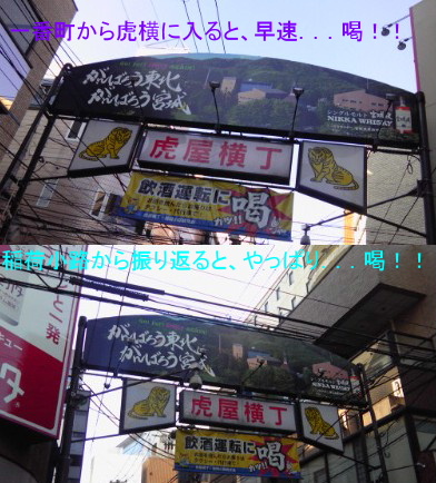 今日は久しぶりに朝の虎横を歩いてみたら、何と、頭の上から、一喝されてしまった。そうそう、飲酒運転は絶対ダメ。わが仙台は、悲しみの上にこれをみんなの教訓にしなければならないのです。虎クンにも大いに吠えてもらって、市民みんなで、安心の楽しい酔っぱらい天国と安全な交通環境を作ろう。