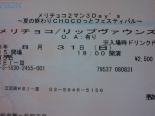 前回・前々回とイカレポンチ気味に浮かれていたのに28日の3:00に愛するメリチョコのメルマガ到着『活動中止』って?なに?何の事?Why?しばし呆然…何度読み返しても…信じられず、現実を受け入れられなく涙涙彼らの気持ちを知らなかったとはいえ!ほんの4日前に独りでハッチャけいた自分が恥ずかしくて、悲しくて、切ないあまりのショックで食欲不振(3kg減)情緒不安定で油断すると泣けてくる~~自分でも気付かないうちに心の中でメリチョコが、かけがえのない大きな存在になってました ♪出会いと別れに涙止めることは出来ないから心と心を重ねる♪ ♪僕の心はぽっかり穴が開いたように昔のことばかり思い出してしまう♪凹みっぱなしのダメダメな私に関東メリッこさんからライヴレポ×2通が届きましたやっぱりメリチョコのハコライヴ行きたくて!!行きます!!おおげさですが人生後悔したくないから!!=3=3東京までの2時間がもどかしい勇気と決断を与えてくれたお二人とこんなおバカな私を快く送り出してくれる留守番二人に感謝しますありがとう行ってきまーす ♪僕たちはいつだって歩くんだ歩くんだ 前を見続けるために♪