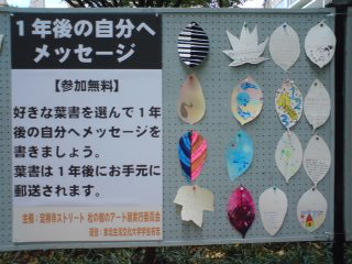 秋も深まったある日[1年後の自分へ]メッセージを書きましょうのイベントがありました。アーティスト目指している大学生の皆さんが制作した個性豊かなカードに自由に書いて下さい⇒1年後に郵送しますでしたので書いてきましたよ~~いつもど~りにお気楽な感じで記入したらしっかり展示されていました。アンジェラ・アキの『手紙』のように=この手紙を読んでるあなたが幸せなことを願います=1年後も私と私のまわりの皆さんが健康で幸せでありますようにあ"ーーよく考えたら来年は受験生の母親だったーーーーどうしょうーー ☆定禅寺St.に展示中☆ アートだわ~ ☆予想ど~り1年後の私宛てにも[タクマくんLOVE]と書いてます。 にひっ