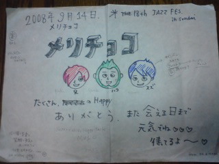 真夏の夜の夢から覚めて魂がぬけている火曜日です。。。【1日目】 生ラジオのFmいずみでメリッこ3人娘(すいません、私も含む)集合です!ようこそ『メリチョコの故郷仙台』へ仙台のメリッこちゃん達にも久々に再会みんなイイコだよ~~ ★ハコ帽子出来上がりーwith「むすび丸」【2日目】 JUNK BOXでのハコライヴ北京餃子で食券購入中の及川兄弟発見ーー今日も元気いっぱいお笑い満載心に染みる歌声です◎ぉ兄ちゃんの白いバスローブ姿がまぶしいスズくんの浴衣姿は男前ーーそして!しっかりとセクシーアングル確認!!(黒でした!笑)ハコくんはワイルドなヘアーと甚平がとてもお似合い「トキドキ」踊ったーー最後のセッションも仲良しバンドで楽しくノリノリだよ~~ ★兄着用バスローブwith ゲットしたメリッこ・ひーちゃん いい匂いがしました ★ちっちさん・ユウコさんとスズくん推薦の『閣』で打ち上げです!【3日目】 ひなチョコ・インストアライヴ大雨の中、3人娘!富谷まで追っかけ==3=3スズくんのオリジナル呼び込みソングでライヴのはじまりだよ~んインストアは周りのスタッフさんや立ち止まって聴いているお客さん(老若男女)たちがメリチョコの唄で笑顔になっていく姿がよ~く見えますそんな幸せな様子を見ているとこっちもハッピーで、うれしい気持になりますメリチョコ♪大好きだよ~♪♪次回は9月のJAZZフェスまで会えないけれど…3days最終日失神しそうなくらいにサプライズな出来事がっ神さまごほうびありがとう夢だけどーー夢じゃなかったぁーーー 壊れ気味です。。失礼。。