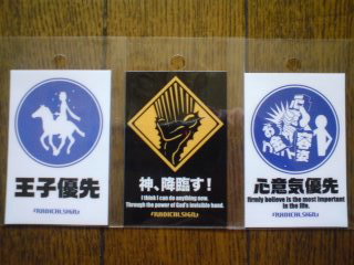 9/9 救急の日も過ぎて9月も中旬突入です。。カウントダウンです。。秋の空は今日まではご機嫌♪だけど、明日からはCHOCOっと下り坂で微妙な感じ。私の気持ちもCHOCOっとブルーになってます。現実逃避気味に、苦手な家庭科に挑戦中…高校時代は浴衣生地の裁ち方に失敗!(母に助けてもらう)・初めて編んだクリプレのマフラーは当日まで未完成!(母に仕上げてもらう)・娘の幼稚園帽子は途中で作成断念!(ごめんね)…の悲しい過去ばかりなのに!だいぶ無謀なチャレンジです。美術は得意なんですけどね◎ もう勢いとノリ♪でやるきゃないです◎「私は0型です。大雑把ですが何か?」→私用のステッカー。14日まで出来上がるかなぁ~~ドキドキする~~♪ =とき ドキドキ×2 するんだ君の仕草に= =とき ドキドキ×2 するんだ君の優しさに= ☆LOFTでステッカー購入×3 ★やっぱり兄は『王子』様です♪ ★そうハコくんはメリチョコの『神』なのだ! ★スズくんの男前な『心意気』が大好きー♪