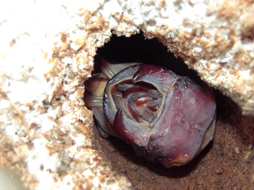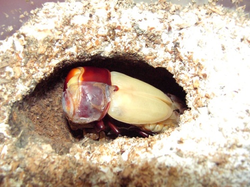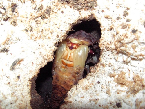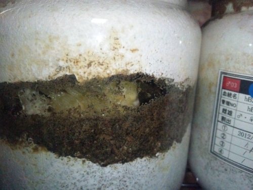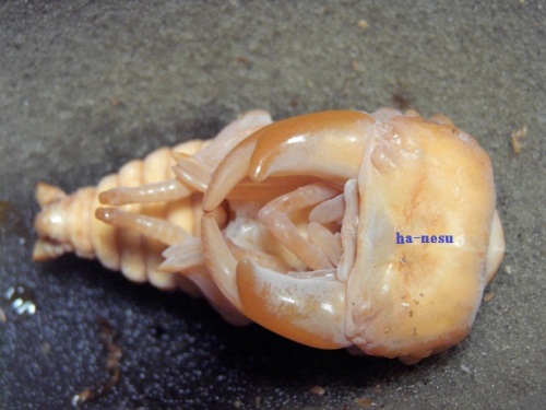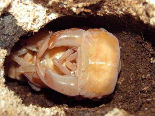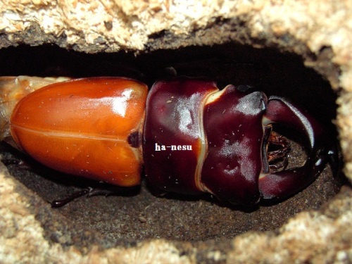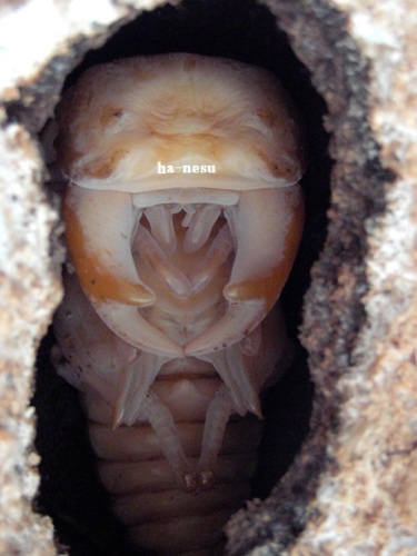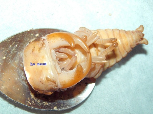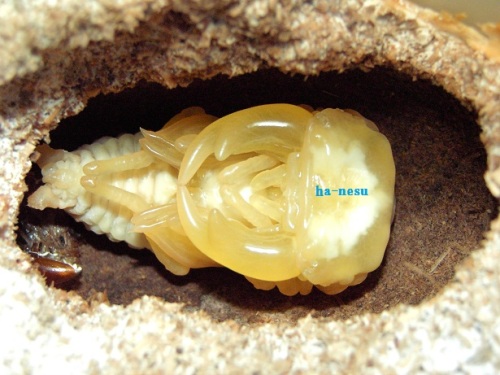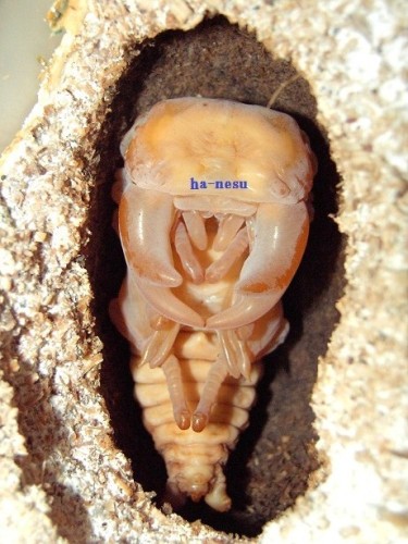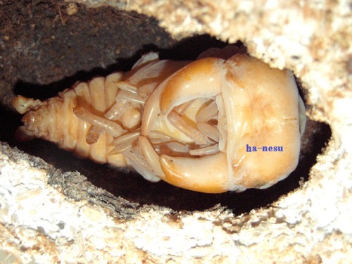 今期メインの種♂の第三のライン(クロス)が、蛹化した。♂2頭しかいないが、その2頭に印を付けていた。今期 あてにならない印だけどね。(笑)数少ない見える蛹室。しかも、クリアボトル!・・・でも、顎が見えづらい。(笑)交換時は、糞をする前に 30gあった幼虫で、3頭いた内の2頭目の蛹化!容姿は気になるが・・・。蛹室の高さが 低いかな?!・・・後日 人工蛹室に移し、現在 人工蛹室のチビを ここへ移動するかな?・・・まあ、その時に画像を・・・顎は こんな感じ・・・右側が 頭・・・左側が、顎です・・・。 にほんブログ村 ←TOPへ...