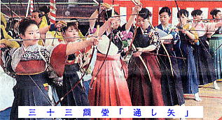 【今 日 の 情 報 : 歳 時 記・催 し・話 題・出 来 事】 ★東山区の妙法院三十三間堂で一月十三日、新成人らが弓道の上達を誓う新春恒例の「通し矢」の弓の引き初めが行われた。 かつて三十三間堂の端から端まで六十六間の距離を一昼夜で何本通せるかを競ったもの。慶長年間に始まったと伝えられ、「三十三間堂の通し矢」とも呼ばれています。全国の弓道者が集まって六十メートルの距離から直径一メートルの矢を競射します。江戸時代に武士が百二十メートル(普通の距離の二倍の長さ)の長い廊下に矢を射通し、腕を競ったのが始まりとされ、京都府弓道連盟と妙法院(三十三間堂)が成人の日の時期に毎年開いている。今年は新成人の男女と一般の部を合わせ、約二千人が参加した。 三十三間堂の西側に特設された射場で、振り袖に袴姿の女性達が、横一列に並んで六十メートル先の的(直径五十センチ~一メートル)を狙って、ゆっくりとした動作で矢をゆがえ、冬の冷気を切り裂くような鋭い矢を二本づつ放った。 ★同じ日「柳のお加持」が行われる。正式には「楊枝浄水供」と呼ばれ、後白河天皇の病が浄水で治癒したことに由来します。浄水に柳の枝を浸してその水を参拝者の頭上に振りかける秘儀で功徳が分け与えられる。特に頭痛に効くという。古くは平安時代に行われ、それによって柳にまつわる伝説が数多く生まれた。 全国都道府県対抗女子駅伝 続 報我が京都が42.195メートルのコースを大会新記録を更新して首位を守り、2時間14分58秒で四年連続十二回目の優勝を果たした。 第一位 京都 2時間14分58秒 第二位 兵庫 2時間17分30秒 第三位 岡山 2時間17分56秒 第四位 宮崎 2時間18分56秒 第五位 神奈川 2時間19分10秒 第六位 福岡 : 第七位 熊本 : 第八位 静岡