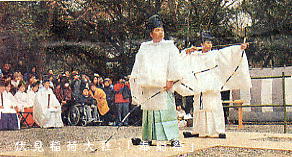 【今 日 の 情 報 : 歳 時 記・催 し・話 題・出 来 事】伏見区・伏見稲荷大社で一月十二日、新春恒例の邪気を払う「奉射祭」が営まれ、五穀豊穣と家業繁栄を願って神職が神矢を放つ神事。 本殿での祭事に続き、神苑斎場で奉射の儀が営まれた。 「お弓始め」とも呼ばれる同祭は、副斎王が中央から四方に六本の神矢を放って場を清め、大蛇に見立てた長さ約十三メートルの注連縄の中央にある直径約一めーtの的に向かって、神職二人が約十八メートル離れた位置から計四本の矢を交互に放つ。かっては矢の当たり具合でその年の豊凶を占ったとされ、現在では邪気払いなどの神事となっている。 ★上京区・武者小路千家の初釜が一月十二日、家元・官休庵で始まった。千宗守家元が茶室弘道庵で濃茶を練り、京都の政官界、文化界の著名人らをもてなした。濃茶席の床には、今年の宮中歌会始のお題「火」にちなんだ大きな掛け軸「祝融松」が掛けられ、中国の火の神「祝融」が住むという山に豊かに茂る万年の松に、新たな年の変わらぬ栄を願った。 千家元は、昨年好んだ棚、「真青漆柱紅台子」に、青色鮮やかな交趾菊桐紋水指、木地に白菊の模様を置いた炉縁などで晴れの日を演出。「子」年にゆかりの大黒耳鑑付の釜などを用いて、心を込めてお点前した。初釜は十五日までで、約八百人が招待予定。