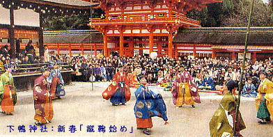 【今日の情報 : 歳時記・催し・話題・出来事】左京区・下鴨神社では一月四日、新春恒例の「蹴鞠初め」が行われた。王朝装束をまとって古式ゆかしく白い鹿皮の鞠を蹴る蹴鞠は、中国・殷時代の雨乞い神事が起源とされ、国内では平安時代以降に宮中で流行、鎌倉時代には武士や庶民の遊戯として広まった。 六名から八名が一座となって、相手が受けやすいように優雅に蹴り続ける。 神社本殿前に設けた約十五メートルの鞠庭に色鮮やかな水干や烏帽子姿の装束を身に付けた八人が輪になり、「アリ」「アヤ」「オウ」の掛け声と共に見事な足裁きで鞠を蹴り上げ、初蹴りを奉納する。 ※飛鳥井流、難波流などの流派がある。京都御所の小御所北側に、「蹴鞠の庭」がある。参考画像は http://blogs.yahoo.co.jp/oinaijp/folder/279901.html まで