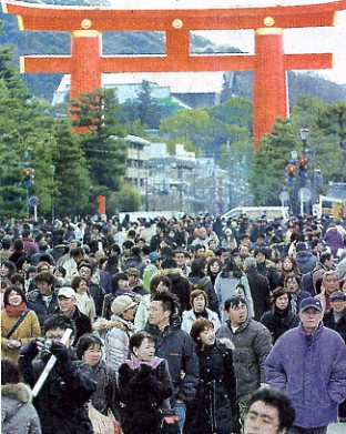 【今日の情報 : 歳時記・催し・話題・出来事】★東山区・六波羅密寺では正月三が日、結び昆布と小粒梅を若水でいれた煎茶「皇服茶」が毎年、振舞われる。京都に疫病が流行した折、空也上人が薬茶をふるまったことに始まる。村上天皇も服したことから「皇服茶」の名称が付いた。京都では「大福茶」と言って、各家庭でも行われている。★京都は元日から激しい冷え込みとなり、ぴりりと冷え込んだ新春を迎えました 。 正月の京都は各社寺への初詣から始まりますが、何と言っても伏見のお稲荷さん詣りです。(私は月詣りをしております)。全国に約四万あると言われる稲荷大社の総本社で、京都における最も古い神社の一つであり、古くから五穀豊穣、商売繁盛の神として朝野の崇敬を集め、参拝者は絶えることがなく、一年中全国から多くの参拝でに賑わいます。特に正月三ヶ日の伏見稲荷大社では初詣客が参道から本殿まで長い列を作り、大晦日から三日までの人出は推定で伏見稲荷大社:二百七十万人、全国で四位の人・人・人でひしめき合った。 【伏見稲荷大社について一言】 創建時代は不詳で定かではないが和銅四年に秦伊呂具が稲荷山の三ヵ峰に三社を創祀したという。秦伊呂具が餅を的にして矢を射ったところ、その餅が白鳥になって山の峰に飛んで行き、そこに稲が生えたので、イナリの社名になったと伝わる。平安遷都後、稲荷信仰の中心的存在となった。また、天長四年(827)空海が東寺の塔材用として、神材を伐ったことから真言宗と結びつき、益々繁盛した。 本殿...五間社流造り、檜皮葺きで明応三年(1494)の建築で、唐獅子牡丹唐草などの桃山風彫刻が施されている。 御茶屋...御水尾天皇から下賜された茶室で仙洞御所から移された。屋根は入り母屋造り、桟瓦葺き、書院造りの建物。 ★東山区の八坂神社で一月三日、新春恒例の「かるた始め」が行われ、古式ゆかしい王朝絵巻さながらの優雅な催しに大勢の参拝客が楽しんでた。今年で三十七回目。百人一首ができた京都でかるた文化の伝承をしようと催している。 会場になった境内の能舞台には、水干姿の童子、童女や、紅袴に子袿姿の古式ゆかしい衣装を纏ったかるた姫が二十二人、二人ずつ向かい合い、百人一首の札を取り合う「初手合わせ」(歌の上の句を読み上げると、かるた姫らは「はいっ」と声をあげながら床に並べられた下の句の札を取り合う)を行った。参考画像は http://blogs.yahoo.co.jp/oinaijp/folder/279901.html まで