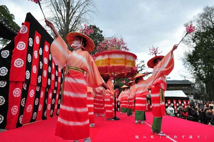 はねず踊りは 、平安期、小町を慕う深草少将が百夜通いの誓いを立て、はねずの咲く小野の里に毎晩通い続け、百夜を前に残り一夜というところで疲労に加え大雪に見舞われたことから病に倒れて亡くなった、との伝承に基づいて始まったという。 梅の花にちなむ薄紅(ハネズ)色の小袖をまとい、編み笠に紅梅の枝を飾った地元の女児十六人が小町と少将に別れて「少将さまがござる、深草からでござる」と百夜通いの悲恋の伝説を、わらべ歌を唄いながら雅楽に合わせ、あでやかに優雅な舞いを披露し、観客を魅了する。