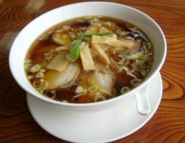 麺のほうが先にやってきた。厚切りの焼豚が5枚入っている。ロースの断層がきれいに出た、みごとなチャーシューである。ほどほどにしっかりしていて、ほどほどに柔らかい。噛んで食べて肉の繊維を噛みちぎって、その食感を楽しむためのチャーシューである。やや濃い目の醤油スープに中細の縮れ麺がよく合っている。薬味は他に、サヤインゲン・メンマ・ネギ・刻み玉ねぎなど。玉ねぎが入るのがこの地域らしいだろうか。保守本流をまっすぐに行く中華系のチャーシュ麺である。