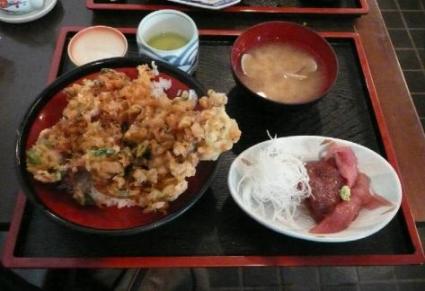 深さのない器で、そこにドンとかき揚げが艦載されている。ご飯も少量なので、しごく頭でっかちな印象の丼となっていた。甘辛いタレがまだら状にかかり、その濃淡を楽しむように食べすすめる。どの品にもサービスの一品が付いてくる。これには、中おちが付属していた。