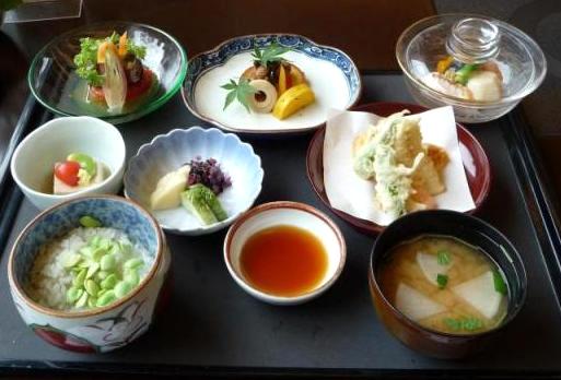 デザートと飲物以外は、大きな盆にひとそろいでやってくる。懐石のような一品出しを期待していたので、これには少し拍子抜けした。