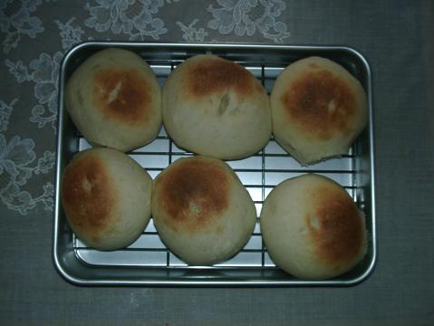HBを買ってから食パン以外のパンをはじめて作りました。(十数年も何をやってたんだ。)ベーコンポテトパンです。上にしか焼き色がつきませんでした。焼き饅頭みたいだ。妻と娘の評価は「芋が多い。」「味が薄い。」でした。レシピどうりジャガイモは2個使ったのにサイズが大きかったかな?それから胡椒とマヨネーズをもっと入れればよかった。