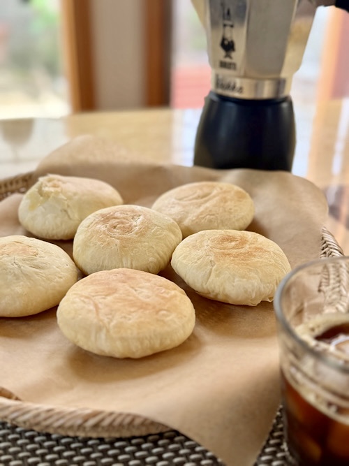 今日も暖かいと言うか、若干暑く感じる我が家地方です。セーターを何枚か洗い、安物のダウンも洗いました。その間に太陽餅を作っていたので、生地を休ませる時間がよかったのか、ワタシが学習して賢くなったのか?今回はいい感じに焼けました。この感覚を忘れないように近いうちにまた焼かないと。今回も失敗したら泣く~と、オーブンを覗く時はドキドキ。1つだけ、小さな穴から滲み出ていますが💦 あ~嬉しい。早速試食です。はぁ~美味しい やっぱりワタシはこのお菓子が大好き太陽餅は台中が発祥のお菓子です。台中の駅前の菓子屋には太陽餅の看板がたくさんありました。太陽餅の太陽は丸い形と思いますが、餅と言ってもお餅は入っていません。中身は麦芽糖の優しい甘さの餡です。この餡、多少はモチモチ食感ですけど。台湾旅行をされる方は多いと思いますが、お土産に人気のお菓子はパイナップルケーキやヌガーです。太陽餅は見た目地味だし、試食しても❓❓って感じだと思います。ワタシも最初はパイナップルケーキ推しでした。太陽餅は全く眼中になかったのですが、いつの日か、大好きになっていたのです。素朴な味に惹かれたのかも。パイナップルケーキは作り過ぎて飽きてしまいました。失敗する事なく美味しく出来るので、面白みがなかったかも。太陽餅は失敗する事が多くて、出来るまで意地になって作り続けて、やっとコツを掴む。で、久しぶりに作って、そのコツを忘れているからまた失敗。で、また作る。この繰り返しです。アホですわ💦食べるとボロボロこぼれるし、口の中の水分持っていかれるし、これ美味しいの?って感じですが、誰が何と言おうとワタシは好き。気温が上がってくると、毎日飲んでいるカフェラテもホットからアイスに変わり、朝に作る冷たいジュースがめちゃくちゃ美味しい。2月に行った香港のキャセイ航空で飲んだキャセイデライトが絶品で、それを真似したものを帰ってきてから毎日飲んでいます。朝のお楽しみなんです。キャセイデライトはキウイベースでココナッツ風味が美味しいドリンクですが、最近はパイナップル、デーツ、ミント、ココナッツミルク、豆乳をバイタミックスに掛けています。氷を入れるとバイタミックス効果でかき氷のようになって一層美味しいのですが、お腹が冷えるので控えています。その代わりに、パイナップルはカットして冷凍にしているのを使うので冷たいですよ。