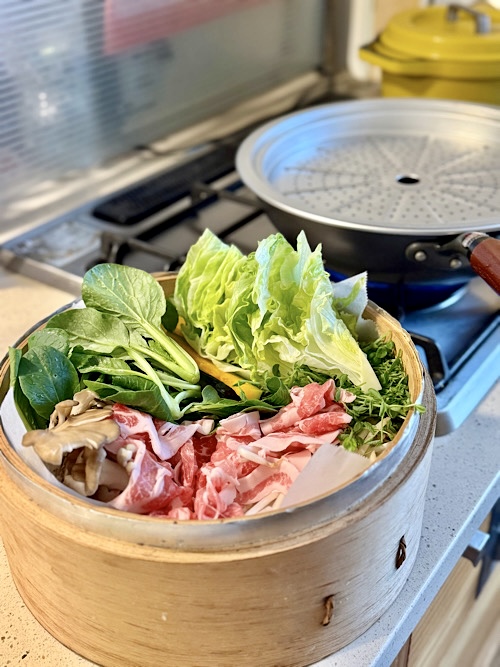 ぱっと見はご馳走様に見える⁉️いやいや、ほとんどが野菜です。ヘルシーと言う、いい言葉があるからね🤣蒸籠って流行っているでしょう?無印でも売っていますね。ワタシは台湾に通っていた頃に蒸籠を買い、この蒸籠は2代目です。内径25cmですが、一人用のは15cmです。朝食時はこの一人用が便利でよく使っています。蒸したのは、豚肩ロースの薄切り肉を数日前から塩をして置いていたもの。この下にはもやしをたっぷり敷いています。ご近所からいただいた小松菜の間引き菜、最近お安くなったレタスとか色々と。あとは蒸すだけ。タレはポン酢に色々入れてカスタマイズしたもの。胡麻ダレも美味しいですよ。常備菜並べて、お味噌汁があればご馳走でしょう?手抜きなのにね