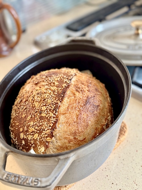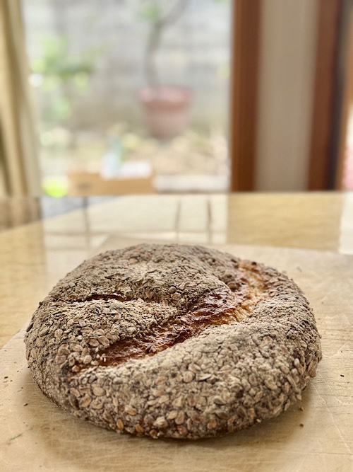今回も加水120%のカンパーニュ 。朝、ライ麦粉と全粒粉で湯種を作り冷蔵庫へ。本捏ねは夜にして、12時間ほど保冷庫へ入れていましたが、今回は過発酵になってしまい、慌てて成形。北海道産小麦のヌーベルバーグは、思ったより扱いやすい粉で、成形はいつもと違う形にしてみました。どう成形したらいいかなんて、正解はないです。生地と向き合いながら決めるって、そんなカッコいい事は無理で、ワタシの場合は気の向くままです。自分が食べるのだから、自分の好きなように焼くだけ。季節とか体調も関係あるのか分からないけど、今はこの高加水のカンパーニュしか食べたくない。同じパンを飽きもせず焼き、そのブームが過ぎたら違うパンを焼く。その繰り返し。自由気ままなパン焼きってこの事。本を見ると、あんなの、こんなのを焼いてみたいなぁと思うのだけど。凝ったパンはプロにお任せです💦美味しそうなパンがいっぱいElle Gourmet (エル・グルメ) 2025年 5月号 [雑誌]楽天ブックス