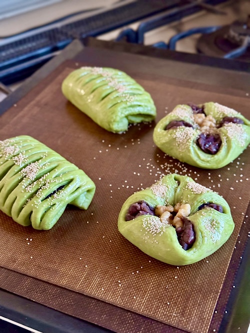 ホイロが終わり、今から焼きますよ~の写真。この時点で朝6時。今日は比較的ゆっくりです。高温で10分位焼きました。バターの漏れは一切なしです。あらら~ 中心に合わせた生地が弾けて、求肥と餡子が丸見えです💦メッシュローラーを掛けた網目が中心にくるはずだったのに、ずれているし💦と、予定外のミスはありますが、美味しそうに焼けましたよ。夫と義弟が二人で朝6時からタケノコ掘りに行っているので、もうすぐ帰ってきます。帰ってきたらこれでお茶をします。食べるのが楽しみ~餡子は昨日炊き、求肥はレンジで作ったものです。今日のデニッシュは、出来上がり4個でバターは50g使いました。この程度だったら許せる範囲かな?と、自分に甘いです(笑)デニッシュパン、手間と材料費が掛かり、買えばお高いです。勿論、パン屋さんのような完璧なものではないですが、こだわって作るワタシパンも結構イケていますよ と、自分で言う。これも門間みかさんのオンラインレッスンのお陰なんですけどね。ワタシ流にアレンジしまくりですが