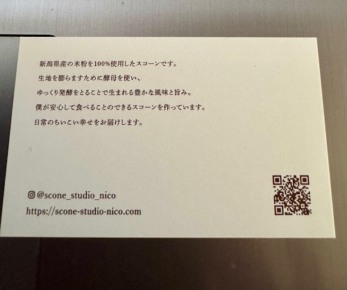 スコーン熱が高かった時、インスタでものすごく美味しそうなスコーンを見つけて気になっていました。お店はないようで、催事や通販で買う事になります。通販の予告があり、販売直後はアクセス集中で、カートには入れたのだけど、決済でもたもたしていたら買えませんでした💦2回目の販売日には、準備万端にしてカートイン、決済を済ませて無事に買えました。そんなスコーン屋さんは、nicoさんです。楽しみにしていたスコーンが冷凍便で届きました。ワクワクして開けると、なんて美味しそう種類が同じのが2個づつ、5種類入っています。どれから食べようかと悩み、やっぱりプレーンでしょう。米粉のスコーンは初めて食べました。湿式米粉かな?酵母は何?何日寝かせているのだろう?とか、感覚を研ぎ澄ませて食べる。← ウソフムフムなるほど~と、食べていると夫が来たので、半分こする。で、クリームチーズに粒餡を乗っけて食べてしまいました💦 プレーンじゃないやん(笑)タイミングとしては、スコーン熱は収まってしまったので、美味しく普通にいただきます。ホントですよ(笑)