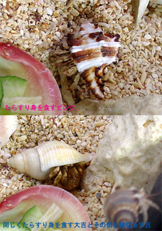 ベビー3匹が暮らすベビーヤドカリ亭にもたらすり身を入れてみました。