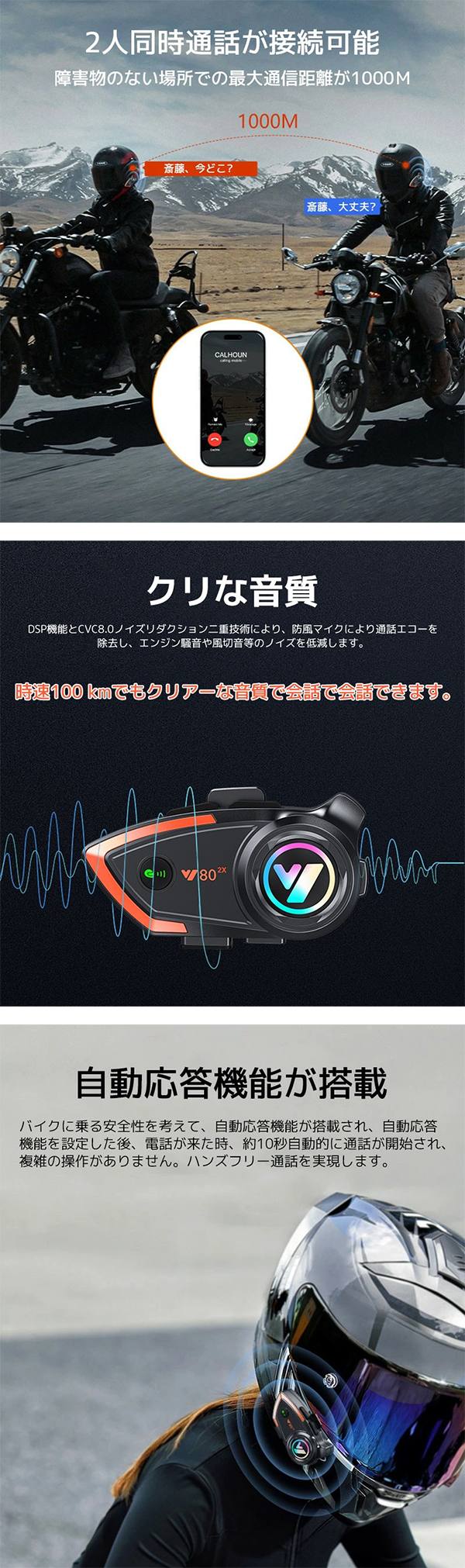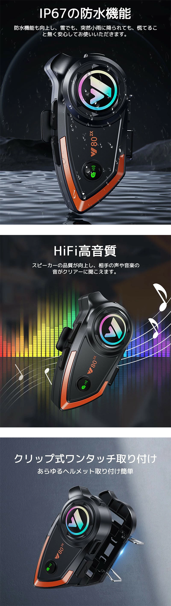 バイク インカム 通信 ヘルメット装着 同時通話 IP67レベル防水
