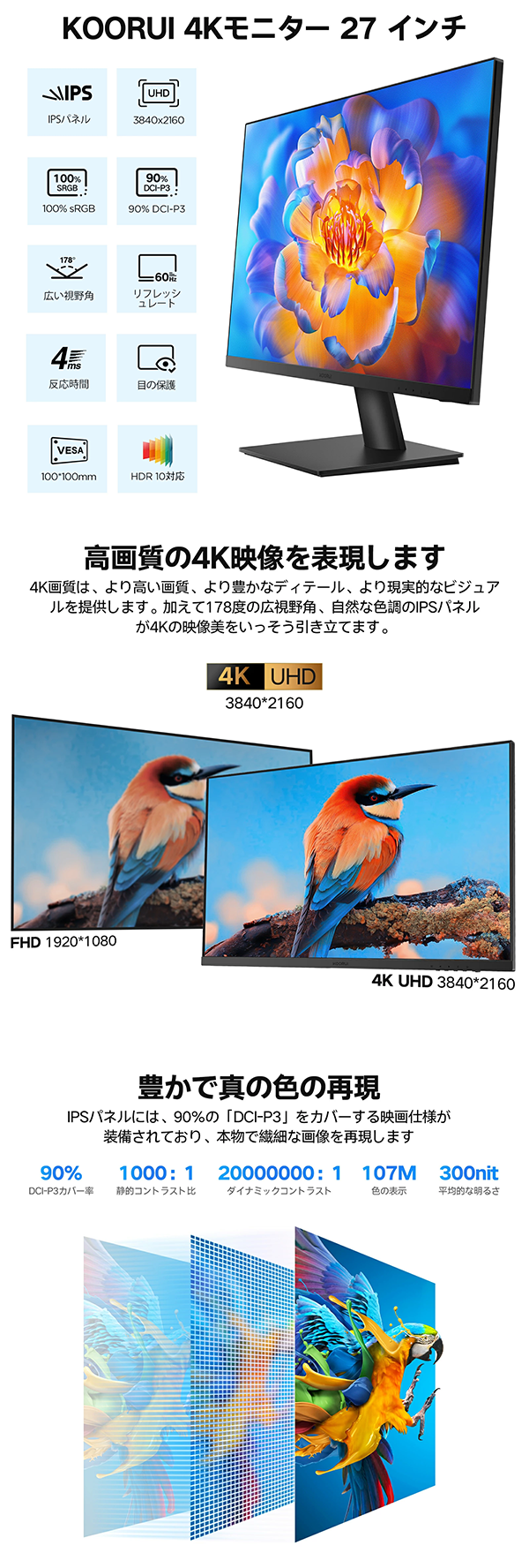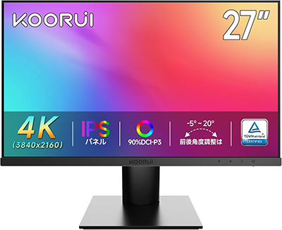 ▶ Amazonのサイト: KOORUI 27インチ 4K モニター IPS 非光沢 ディスプレイ (3840×2160/HDR10/DCI-P3 90%/VESA対応) 傾き調整 デスクトップモニター HDMI/DP接続