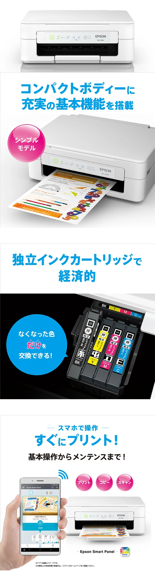 • エプソンのプリンター EW-056Aは、プリント、コピー、スキャン機能を備えたコンパクトなA4カラーインクジェット複合機です。