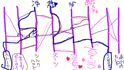 では第4回のアミダですよ~コテロリより右がありえない事になってました。自分のアミダがだんだんやばい方向に向かうにつれて私が願ったのは、『でっていうは嫌。でっていうは嫌。』でした。ソードって、着ぐるみって言われたにも拘らず無視して…。…そして楓華が自分で書いたコテロリを踏んで言ったのが、「どうせならでっていう…。」だったという。結果私が描いたのはそう、ソードフォームでした。顔を描くと切ないので、顔だけノーマル。コテロリと言う新ジャンルが生まれた瞬間でした。って言うか編集長の絵が素晴らしい。実は幸一のストーカーにはかなりの細かい設定がついていました。…すごい。この後、沖南家で1番と言う企画が起こりました(ログとって無いので覚えてません…ソーリー…。編集長は一番強く、悠斗さんは馬鹿だって事になりました。…実は悠斗さん一番弱いんじゃ…。…わが子ながら悠斗さん、哀れな子です。では最終戦。自由課題でした。自由課題だからといって、CP絵を描いていいとかそんなことは無かったんですが…。早朝のテンションって事で勘弁してください。…そして私はコレだけでは止まらず…残りのログは危なすぎるので止めておきます。…おまけ。誰かが来るまでの時間つぶしに私と編集長が描いたもの。相変わらずの電王ですいません(汗