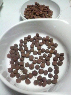 今日のお散歩は全く違うコース。 おやつやペットグッズの物販もやっているペットサロンに行って、コタローとサッちゃんが大好きなさつま芋ジャーキーを買うための特別コース。 ところが、物販コーナーのリニューアルとかで、 棚は空っぽ。 ( ̄▽ ̄;)がーん まだ取り扱い商品も選定中とか。 リニューアル後もぜひともさつま芋ジャーキーを扱ってもらえると助かるんだけどなぁ。 残念、コタロー。 さつま芋ジャーキーはまた今度ね。 日曜日の今日は、コタロー&サッちゃんのトッピング下ごしらえの日。 と言っても、野菜や肉類は買ってきた時に小分けにして冷凍しちゃうから、たいしたことはしないのよね。 少し時間かかるトッピング用の材料をストック分作るだけ。 今日はカッテージチーズを補充するのと、初ひじきふりかけ。 ひじきを煎って粉状にして保存するというのを初めてやってみました。 焦がさないように水分飛ばしながら混ぜ続けてないといけないから、時間かかった~。 しかも、ひじきってこげ茶色というか、黒いから、 焦げてんだか焦げてないんだかわかりにくいし(苦笑) なかなか香ばしいひじきふりかけができました。 あとで粉状にしなきゃ。 今夜はレタス、キュウリ、豚しゃぶしゃぶ、 すりおろしニンジンと今日作ったばかりのひじきふりかけをトッピング。 サッちゃんのなんて、ドライフード隠れちゃってるし。 コタローは、もうよだれで脱水症状になるんじゃないかってくらいよだれ垂らしてました。 コタローたちのおかげで、こたっぺ☆も二枚ほど豚しゃぶ肉のおこぼれにあずかれましたわ(^o^;)