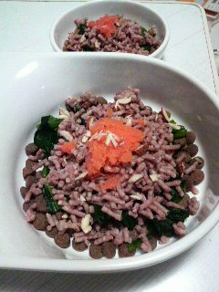 外にも出ず、うがいしたり、市販の喉スプレーしたり、 喉あめ舐めたり、一日養生してたんですが、喉がだけでなく、鼻もやられてきました。 アレルギーでただでさえ鼻が悪いのだけど、 重度の鼻水鼻づまり。 鼻が詰まったら、口呼吸しかできない。口呼吸でさらに喉が・・・ しかも鼻の不調から体が火照るし。 悪循環だぁぁ(ToT) でも、熱が出ないのはラッキー♪ 明日はやっと病院に行ける。 薬もらって早く治そうっと。 今朝はラムの内蔵肉ミックスとラムの生骨をトッピング。 夜のトッピングは、茹でたアスパラガス、茹でたさつまいも、その茹で汁、納豆、そしてカッテージチーズでした。 そういえば写真撮らなかったな。
