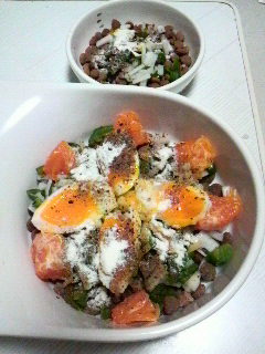先週の月曜日に耳鼻科へいき、薬をもらってきたものの、 喉の痛みがなかなか回復せず。 金曜日にもう一度薬をもらいにいき、なんとか日曜日には風邪は治りました。 でも、喘息はまだまだ。 徐々に良くなってきているんだけど、 動いたり話したりすると息苦しくて咳が出るし、 自転車こいだだけで気管支がヒューヒュー。 アパートの階段では呼吸困難で死にそうになるわい(--;) 汚い話だけど、積極的に痰を出すようにして、気管支が詰まらないように頑張ってます。 本当は数日安静にしたいんだけど、そういうわけにゃいかないしなぁ。 喘息ってよほど目の前でひどい発作を起こさない限り、なかなか理解されないからね。 関西のほうでは、新型インフルエンザが流行りだしてきて、マスクが足りないみたいだね。 少し過剰反応な気もするけど、抵抗力が低い人たちが優先して使用できるといいよね。 こたっぺ☆は、ずっと風邪菌を撒き散らさないようにマスクしてるし、咳もしてるから、すれ違う人たちにインフルエンザと思われてるかも。 久しぶりのトッピング、今日は茹でた絹さや、大根おろし、アボカド、びんとろまぐろのお刺身でした。