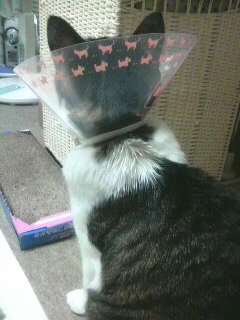 コタロー&サチへのおめでとうコメント、本当にどうもありがとうございますそんな温かいお言葉を知ってか知らずか、今コタローは事務所でぐっすり眠っております。毎週欠かさないシャンプーのおかげか、コタローの膿皮症はあれから全く再発なし。ヘルニアも再発してませんでも、今度はサッちゃん。お盆休みのある日の早朝、枕元でサッちゃんが喉のあたりを後ろ足でカキカキしてたの。カキカキするのは普通のことなんだけど、ゴソッと白い毛が塊で抜けたのをこたっぺ☆は見てしまったのだ~ストレスハゲか!?と思ってサッちゃんが掻いていたところを見たらさ~、血が出ちゃってんのよー5ミリ×1センチくらいのハゲと爪で引っかいたような傷。こりゃストレスハゲじゃないわ。その日はパートナー君とアウトレットに行く予定だったのを急遽変更して、午前中動物病院へ。主治医の先生が休みだったので、指名無しにしたらまたまたクロちゃん先生だった。診察台でフリーズするサッちゃんの患部の表面の組織を検査してもらった結果、『好酸球性肉芽種』ではないかと。白血球の中の好酸球が過剰反応を起こす皮膚病で、子猫のときからの歯肉炎と同じく、免疫がたいしたことないものに過剰反応してしまうらしい。そういう体質だもんなぁ。まだちゃんとはわかってないらしいけど「根底にはアレルギーもあるのではないか」と言われているとか。でも、そこまではまだ考えなくても良さそう。痒がってバリバリしょっちゅう掻いている様子ではないからね。とりあえず、軽めのステロイド注射を打ってもらい、1週間以内にもう一度病院へ来てくださいとのことでした。カキカキしてまた傷ついたら困るので、エリザベスカラーをもらって帰りましたが、つけた途端にサッちゃんフリーズそろりそろり歩きはじめても、どっかに引っかかって「すっ・・・進めにゃい・・・」と困り顔でパラボナアンテナ化したサチ。狭いワンルームでは障害物も多いからなぁ。日向ぼっこのために窓枠に乗ることもできず、なんだかストレスハゲも出来そうでかわいそうなので、その日はすぐに外しちゃいました。1週間経つ前に再び病院で経過を診てもらって、今度はステロイドの軟膏をもらって、それを毎日塗ることになりました。塗り薬となると、服着せて掻かないようにするのもちょっと無理かなぁ~。しかも、肩甲骨の間に↑もう一つ同じ肉芽種系のハゲができてしまったので、なんとかエリザベスカラーに慣れてもらうことにしました。こたっぺ☆留守中は何かあると怖いので外しているけど、こたっぺ☆が居る時に付けさせていたら徐々に慣れてきた感じかな。「そ・・・そうかにゃ?」恐る恐る歩くのは変わらないけど、結構カラーの幅の感覚がわかってきたようで、引っかかる度合いが減ってきたし、カラーを付けたままちゃんと水も飲めるし、ご飯も食べられる。ベッドに乗ってきてウトウトしてるけど熟睡は出来てなさそうなんで、夜寝る時は取ってあげてます。だから、基本的にこたっぺ☆が夕方帰宅してから夜寝るまでがエリザベス・サチです。今ではエリザベスのまま持ってこい遊びまでしてます。早く良くなって欲しいとは思うけど、そういう体質だってことで下手すると一生の付き合いになる可能性大よね(--;)「変なもん付けられたら、ロクに毛づくろいもできにゃいにゃ~」首をくるむエリザベスカラーを探していたら、↓こんなの発見。一瞬浮き輪かと思った(^^;)