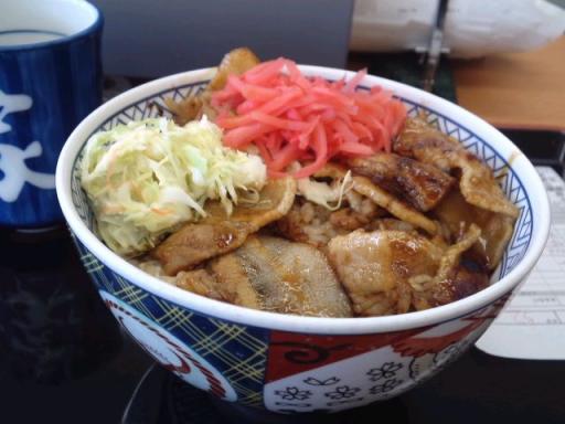 吉野家の新商品です。牛ではなく、やっぱり豚です。砂糖としょうゆをベースにした、甘味と辛味のバランスのよいタレをからませながら焼き上げています。このメニューに使われている豚肉は、スペイン、フランス産等です。焼き上げた豚肉だけではなく、箸休めにコールスローを添えたところは、かなり評価が高いと思います。このメニューで、このコールスローがなければ、かなり口の中が油ギッシュになり、醤油辛さで喉が乾き切ってしまいそうです。個人的には、なかなか満足出来る内容だったと思います。これで、並盛380円也は、流石吉野家と言った感じなのでしょうか。