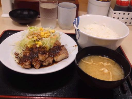 松屋の新しいメニューの、豚テキ定食です。今日は、会社で仕事の残務処理があったので、昼ご飯は外食となりました。何を食べようかと、いろいろ考えたのですが、松屋の前の垂れ幕が目に飛びこんで来て、もう迷わずこの新メニューに決定しました。久しぶりの松屋だったので、食べるシステムも手順も分からず、食券を買うところから、思い出す感じでした。お昼時だったので、店内は満席状態でした。待つこと10分くらいで、それはやって来ました。見かけはなかなかのボリュームです。今回、ご飯の大盛りがサービスになっていました。豚肉なので、非常にあっさりとしていて、肉の硬さも十分柔らかくジューシーでした。只、松屋オリジナルのニンニクたっぷりソースが、少しくどいように思いました。紅しょうががあったので、口の中をリセットしながら食べれば、何とか大丈夫?と言った感じでしょうか。価格は630円で、妥当なところでしょうか。だんだんと、年を取っていくと、味の濃いものは、受け付けなくなってしまうのでしょうかね~
