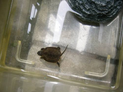 手の上に載せると、とてもちっちゃくて軽く、小さな足をゆっくり伸ばしていました。川にかえそうかと思いましたが、あまりにも可愛かったので、その小亀を持ち帰って飼う事にしました。