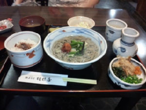 ぞばのゆで汁と一緒に盛られたどんぶり蕎麦汁をぶっかけて、イタダキマス。梅の酸味が、さっばりとして旨いです。