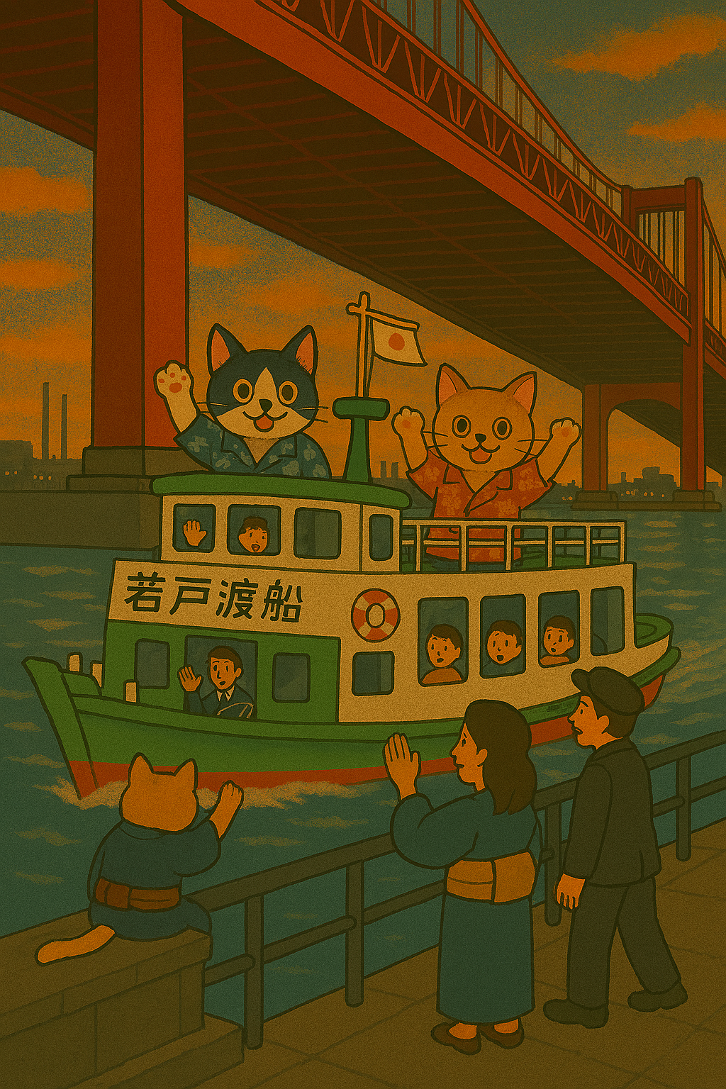 門司レトロや小倉城に訪れて、時間に余裕があれば、若戸渡船を体験しない手はないにゃ。JR戸畑駅北口を出て、のんびり街並みを楽しみながら10分ほど歩けば、戸畑渡場に到着するにゃ。洞海湾を越える市営渡船は、ただの移動手段を超えた小さな冒険。地元の人々にとっても欠かせない存在でありながら、観光客にとっても新鮮で特別な体験になるにゃ。若戸渡船の戸畑渡場周辺には、いくつかの見どころが集まっているのにゃ。まずは「お汐井汲みの場」が注目ポイント。この場所は戸畑祇園大山笠の神事で利用される由緒ある場で、汐水を汲み取る儀式が行われてきたにゃ。階段護岸が整備され、歴史の重みを感じながらその場をじっくり眺めることができるにゃ。※画像はAIによる生成(Copilot使用)そして、渡場のすぐ隣には若戸大橋の迫力満点な橋桁がそびえ立つにゃ。この橋は1962年に完成し、当時は東洋一の長さを誇っていた吊り橋にゃ。橋を見上げると、その赤いアーチが青空に映えるので、壮大な景観を堪能できるにゃ。そして、夜にはライトアップされ、幻想的な雰囲気に包まれるのがまた魅力的にゃ。時折、洞海湾の穏やかな水面を、若松と戸畑を行き来きする渡し船を眺めるのも面白いにゃん。目的の渡船に乗り込むと、若戸渡船ならではの体験が始まるにゃ!たった3分間の船旅だけど、その短さを忘れるほど内容が濃いにゃ。船から眺める洞海湾の穏やかな水面と、真上に迫る若戸大橋の構造美は、普段味わえない絶景にゃ。木製の椅子が設置された船内でリラックスするのもいいし、潮風を感じながらデッキで景色を眺めるのもオススメにゃ。青空が広がる日中だけでなく、夜のライトアップされた工場群や湾内の灯りも、幻想的で心癒されるにゃん。特に船が進むにつれて、湾内に浮かぶ工場群や港町の風景が映り替わるのは、楽しいにゃんよ。※画像はAIによる生成(Copilot使用)若松渡場に着いたら、そこから若松南海岸通り沿いの「若松レトロ」エリアを探訪するのが定番にゃ。このエリアには、1919年建設の旧古河鉱業若松ビルがあり、ルネサンス様式の赤レンガ建築が訪れる人を魅了するにゃ。内部の展示スペースでは、かつて石炭積出港として栄えた若松の歴史に触れることができるにゃ。もう一つ注目すべき建物が1913年建造の上野ビルにゃ。このビルのシンプルな外観と、内部の吹き抜け構造が織りなす雰囲気のギャップが楽しいにゃ。港湾労働者「ごんぞう」の詰所を再現した旧ごんぞう小屋も見逃せないスポットにゃ。ここでは、火野葦平の名作『花と龍』の舞台となった港町の歴史や文化に迫ることができるにゃ。高倉健が演じた映画にも影響を与えたこの時代背景は、大人世代に懐かしさを感じさせるに違いないにゃ。若松南海岸通りには、地元のカフェやショップが点在しているにゃ。洞海湾を眺めながら座れるベンチもあり、観光の合間にほっと一息つくのも良いひとときにゃ。カフェでは地元のスイーツや軽食が楽しめ、地元ならではの特産品も見つかるかもしれないにゃ。※画像はAIによる生成(Copilot使用)帰りは市営バスで若戸大橋を渡るのがオススメにゃ。橋の上からの眺めは絶景で、渡船で見る景色とはまた違った角度から若松と戸畑を満喫できるにゃ。このルートを通れば、移動そのものも立派な観光の一部に早変わりするにゃよ。若戸渡船は、1889年頃に運航が始まり、地域の人々に長く愛され続けてきたにゃ。その歴史的な価値だけでなく、短いながらも地元の文化や自然を楽しむことができる特別な時間を提供してくれるにゃん。#北九州観光 #若戸渡船 #若松レトロ #若松バンド #若戸大橋 #港町の風景 #洞海湾 #レトロ建築 #高倉健 #ごんぞう小屋