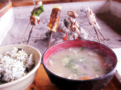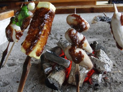 田楽の内容は季節の地物を串に刺して、囲炉裏の炭火で焼いて、調味料として味噌を塗って食べます。