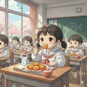 昭和のころ、給食の時間になると、子どもたちの目がキラキラしてたにゃ。